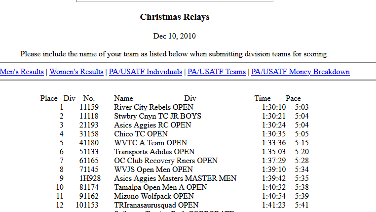 The Christmas Relays are an annual team race put on by West Valley Track Club. Teams composed of 4 members each complete a 4.5 loop around Lake Merced in San Francisco for a total of 18 miles run across the team. To dip into a little bit of history The River City Rebels actually won the race outright in 2010 with an excellent time of 1:30:10 coming to an average pace of 5:03 per mile:
